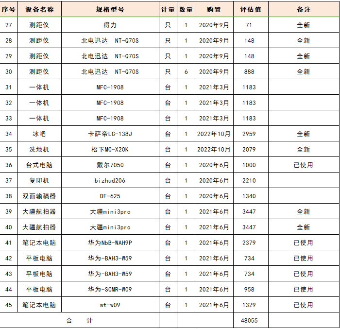 關(guān)注微信公眾號我公司受委托,將于近期拍賣:國家管網(wǎng)集團工程質(zhì)量監(jiān)督檢驗有限公司電子設(shè)備及辦公用品一批,多數(shù)設(shè)備為全新未使用。主要包含:卡薩帝冰吧(全新未使用),大疆航拍器(全新未使用),松下洗地機(未使用),測溫儀測距儀(全新未使用),指紋鎖(全新未安裝),按摩儀(未使用),移動硬盤和U盤(全新未使用),華為筆記本電腦、復(fù)印機、打印復(fù)印一體機,文件柜、屏風(fēng)等。