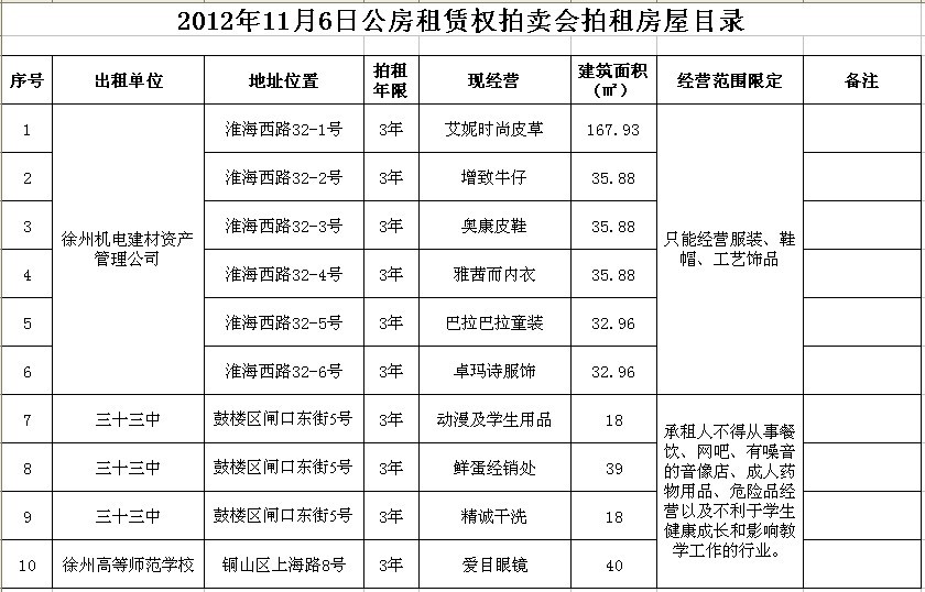 我公司受徐州市市級機關(guān)事務管理局、徐州產(chǎn)權(quán)交易所委托,定于2012年11月6日10時在中山南路55號拍賣廳公開拍賣以下公有房屋三年期租賃權(quán):