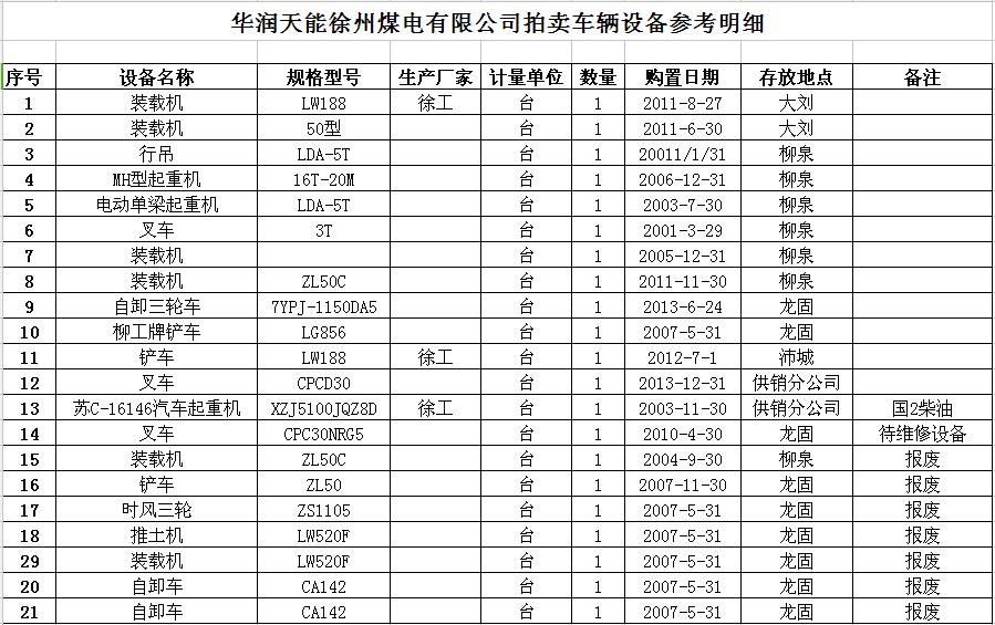 我公司受委托,定于2017年4月12日10時(shí)在徐州市中山南路55號(hào)7樓本公司大廳公開(kāi)拍賣華潤(rùn)天能徐州煤電有限公司各型車輛設(shè)備約二十余臺(tái),主要包括各型裝載機(jī)、叉車、起重機(jī)、鏟車、推土機(jī)、自卸車等。