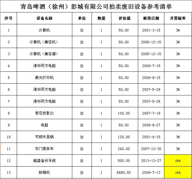 標(biāo)的1:青島啤酒(徐州)彭城有限公司廢舊設(shè)備一批,主要包括:洗瓶機(jī)、灌酒壓蓋機(jī)、殺菌機(jī)、包裝機(jī)、輸瓶輸箱系統(tǒng)、辦公設(shè)備等。