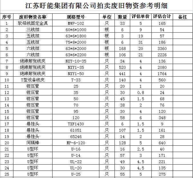 關注微信公眾號受江蘇盱能集團有限公司委托,我公司將通過中國拍賣行業(yè)協(xié)會網絡拍賣平臺以網絡競價的方式公開拍賣廢舊物資一批,主要包括:電纜、金具、線管、開關等(詳見拍品目錄)。