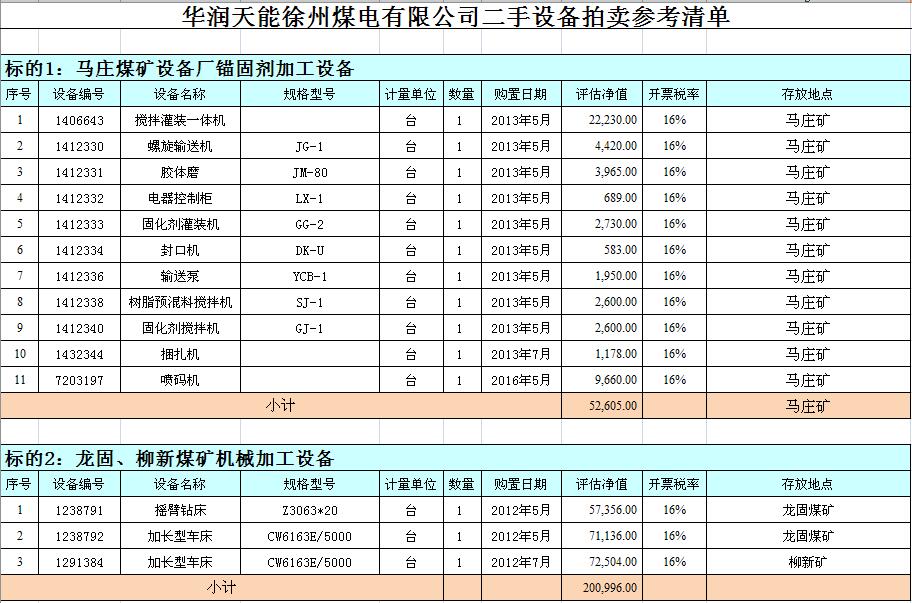 關(guān)注微信公眾號我公司受委托,定于2018年9月18日10時在徐州市中山南路55號副樓三樓本公司拍賣大廳公開拍賣:徐州市馬莊煤礦、大劉煤礦、龍固煤礦、沛城煤礦、柳新煤礦的二手設(shè)備一批。