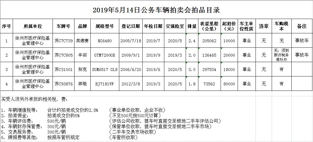 關(guān)注微信公眾號受委托,我公司定于2019年5月14日10時(shí)在徐州市中山南路55號本公司拍賣廳通過現(xiàn)場和中國拍賣行業(yè)協(xié)會網(wǎng)絡(luò)拍賣平臺結(jié)合拍賣的方式公開拍賣以下車輛: