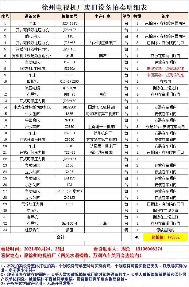 1、徐州電視機(jī)廠廢舊設(shè)備一批。包含:沖床、壓力機(jī)、折邊機(jī)、鉆床、機(jī)床、車床、刨床、磨床、銑床等、空壓機(jī)、電焊機(jī)等。(競(jìng)買(mǎi)人須為具有再生資源回收資質(zhì)的企業(yè)法人),拍賣(mài)參考價(jià)17萬(wàn)元。保證金5萬(wàn)元。